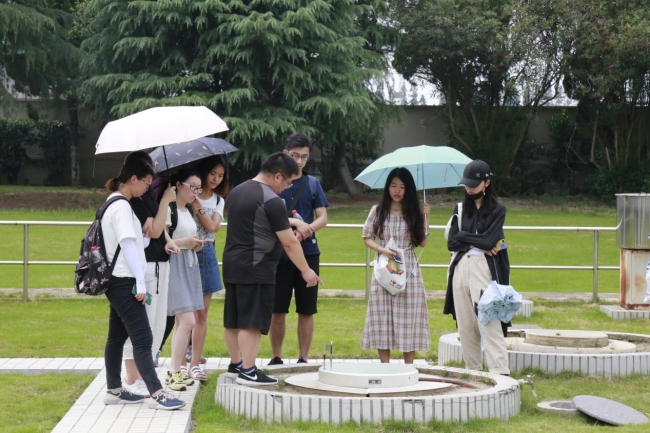 参观了解完松浦水文站内基本情况、GIS实时监测系统、水文站实验室样品流转程序、常用仪器以及操作方法之后,站内的老师带领同学们前往水文站内室外观测场和测亭。在观测场上,老师们主要讲解了蒸发量是如何监测的,并且向同学们介绍并演示日常工作中工作人员是如何通过人工雨量设备和自动雨量设备来对雨量进行监测掌控的。